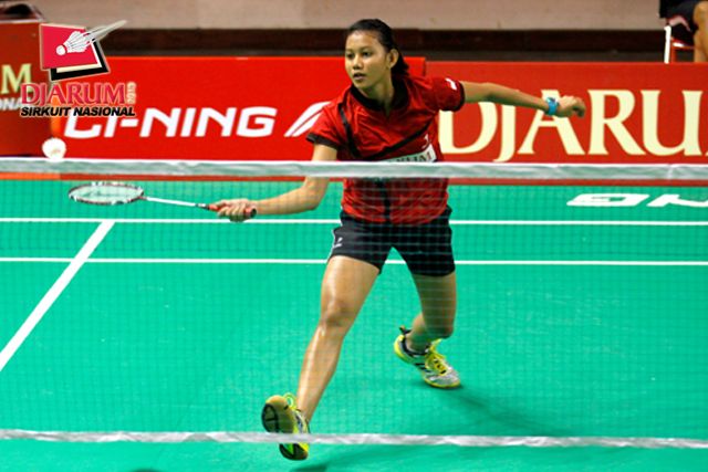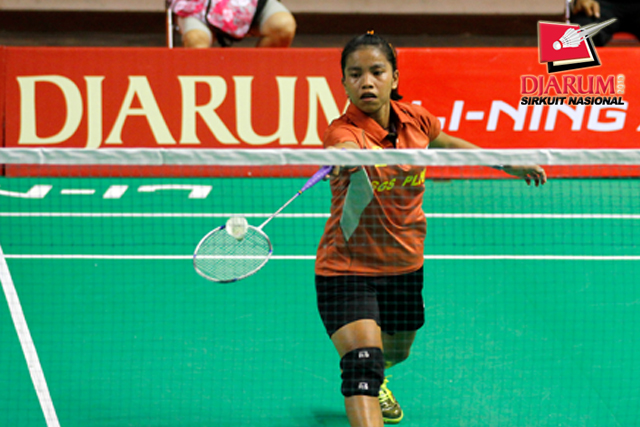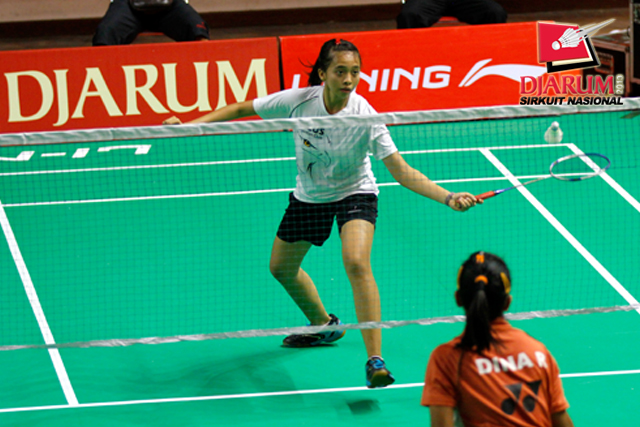 Dina Rahayu (SGS PLN) mengembalikan shuttlecock ke arah Monica Sandia (Focus Badminton).