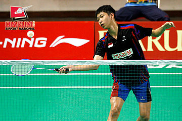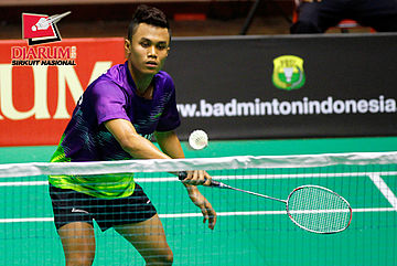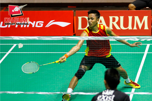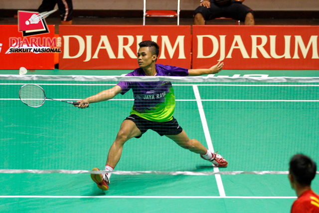 Calvin Ryan (PB Djarum) bersiap menyambar pengembalian shuttlecock dari Zico (PPLP DKI Jakarta).