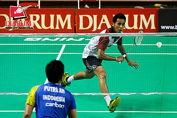 Eka Fajar (Jaya Raya) berusaha menggapai pengembalian shuttlecock dari Azis Iqbal (Gemilang).