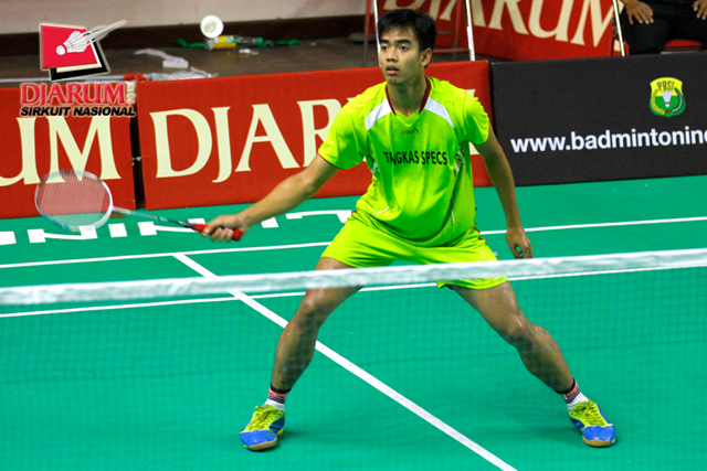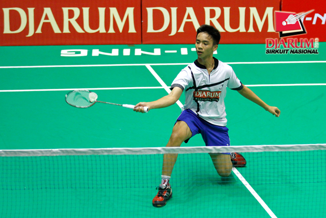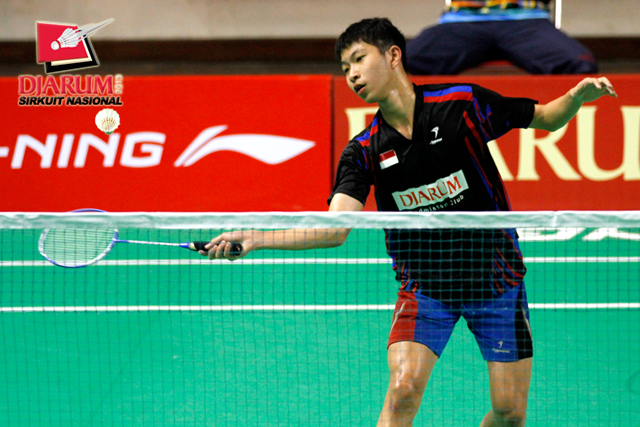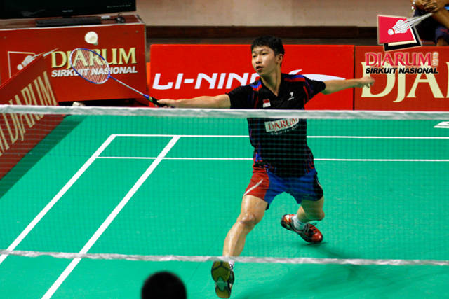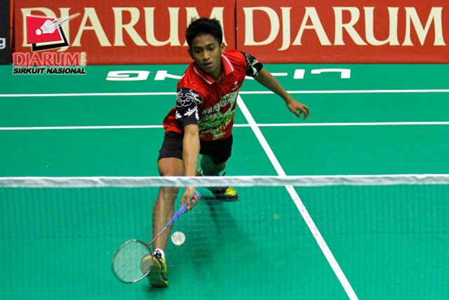 Calvin Ryan (PB Djarum) mengembalikan shuttlecock ke arah Zico (PPLP DKI Jakarta).