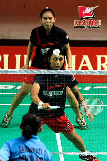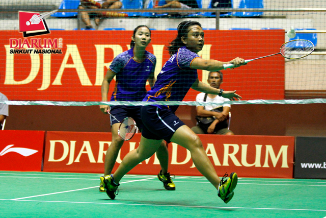 Devi Tika Pertamasari/Keshya Nurvita Hanadia (SGS PLN) mengembalikan shuttlecock ke arah Dian Fitriani/Nadya Melati (Jaya Raya/Pertamina Indonesia).
