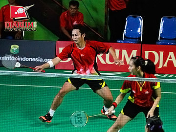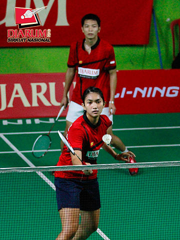 Sigit Sudrajad/Nurbeta Kwanrico (PB Djarum) bersiap mengembalikan kok ke arah pasangan Nugroho/Tieke Arieda (Jaya Raya Suryanaga).