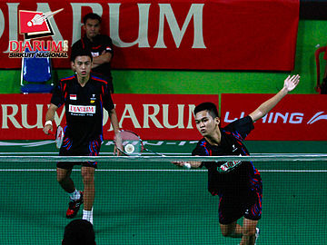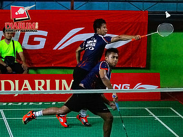 Yantoni Edi/Arsya Isnanu (PB Djarum) saat menyambut serve.