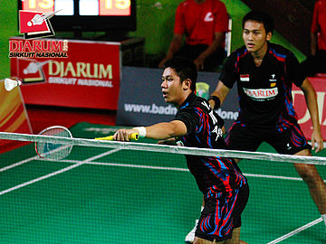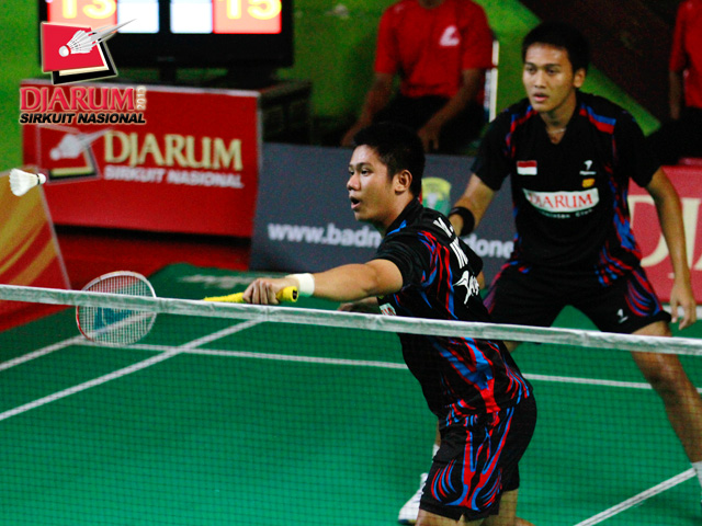 Abu Bakar/Tedi Supriadi (PB Djarum) menyambut serve dari Eduardo/Satelit Nanda (Tangkas Specs).