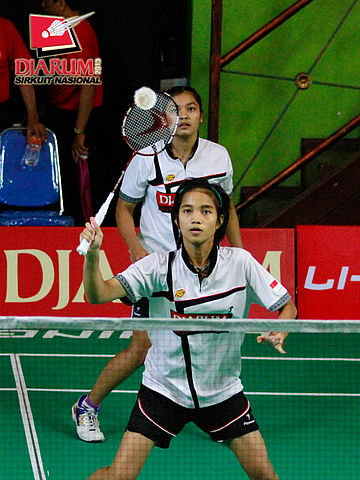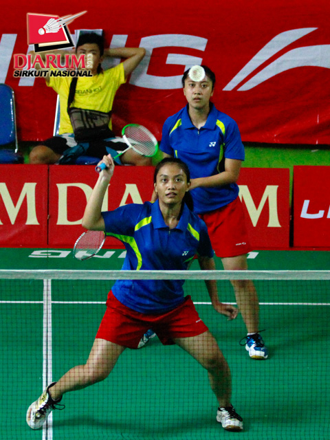 Febriani Endar/Ristya Ayu (PB Djarum) bersiap menyambar pengembalian tanggung dari Fisita/Puteri (Hi Qua Wima/Surya Baja).
