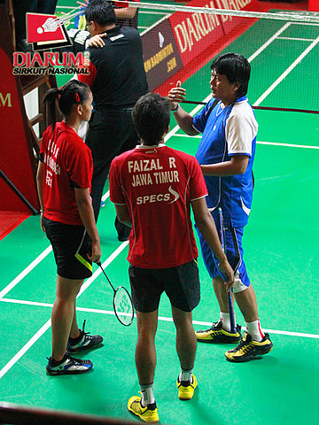 Faizal/Illa Alvionitasari (Jaya Raya Suryanaga) mendapatkan pengarahan dari pelatih saat jeda set pertama.