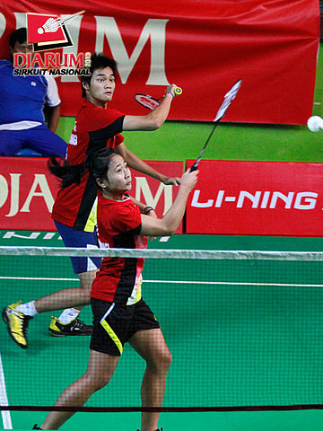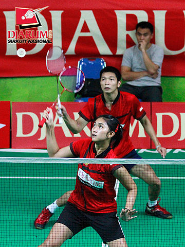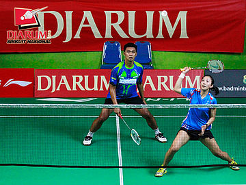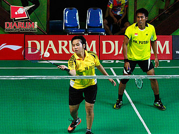 Abu Bakar/Febriani Endar (PB Djarum) menyambar pengembalian tanggung dari Egi Septian/Dini Fitri (SGS PLN).