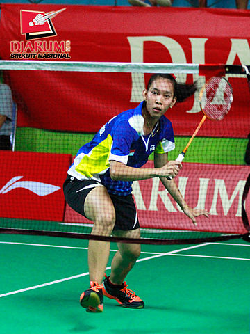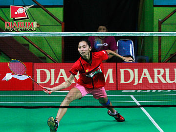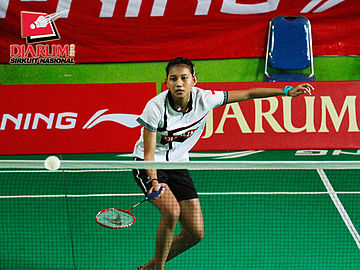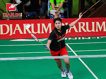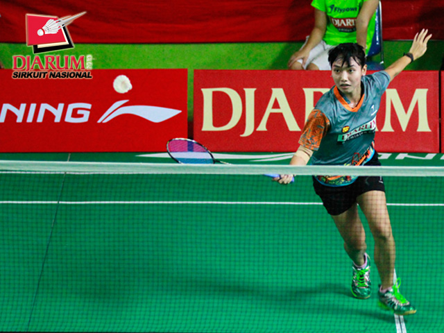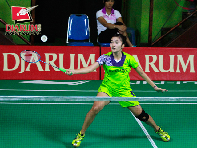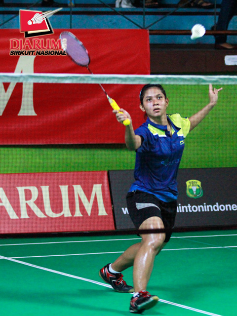Ana Rovita (PB Djarum) bersiap mengembalikan kok ke arah Dian Fitriani (Pusdiklat Jaya Raya).