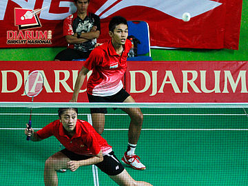 Fajar Alfian/Inten Ratnasari (SGS PLN) mengembalikan kok ke arah pasangan Gea Kamahamas/Anisa Nur (Pusdiklat Pikiran Rakyat).