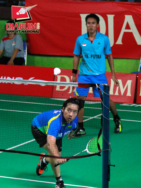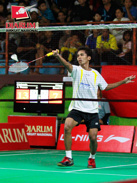 Alamsyah Yunus (Pertamina Indonesia) dengan tenang menyambut pengembalian kok dari Evert Sukamta (Tangkas Specs).