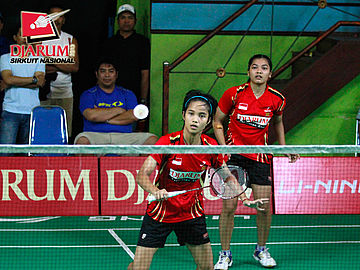 Febriani Endar/Ristya Ayu (PB Djarum) menyambut serve dari Dini Fitri/Inten Ratnasari (SGS PLN).