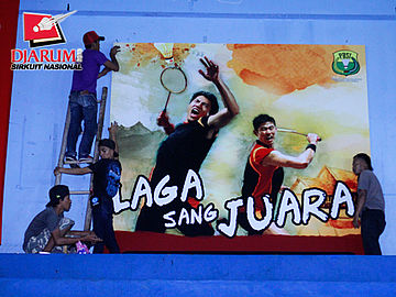 Sejumlah pekerja saling bekerjasama untuk memasang banner "Laga Sang Juara".
