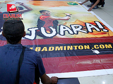 Salah satu pekerja sedang meregangkan banner "Laga Sang Juara".