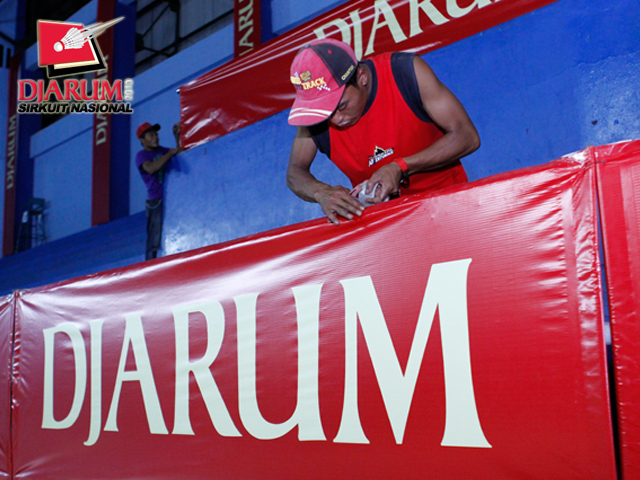 Salah satu pekerja sedang mengencangkan banner Djarum.