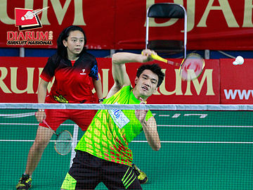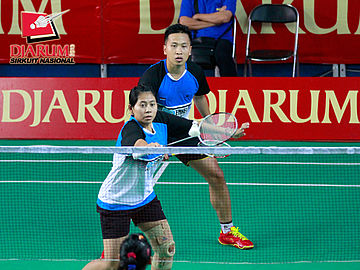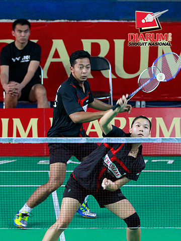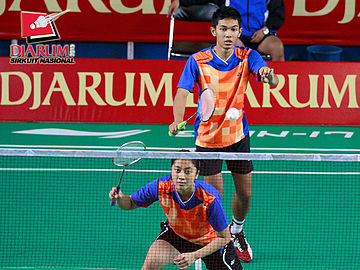 Rahmat Adianto/Deariska Putri (PB Djarum) menyambar pengembalian dari pasangan Ahmad Rivai/Aris Budiharti (Bank Sumsel/Jaya Raya).