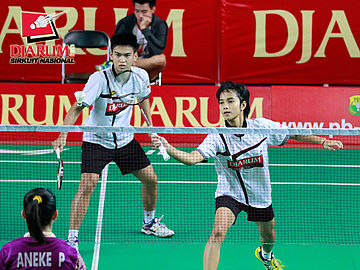 Stefan/Tri Okta (Mutiara Bandung) bersiap mengembalikan kok ke arah Rian Swastedian/Masita Mahmudin (Pusdiklat Jaya Raya).