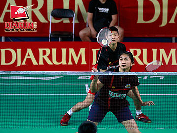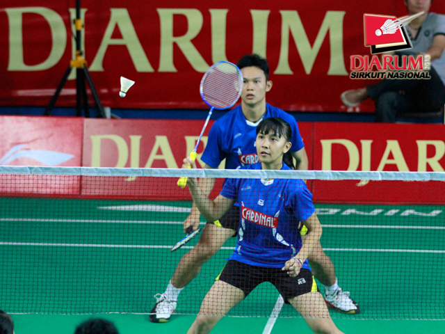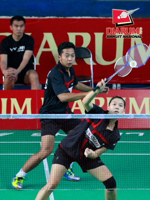 Pasangan ganda campuran taruna PB Djarum, Abu Bakar/Febriani Endar bersiap menyambut pengembalian dari Rizko Asuro/Aneke Putri (Guna Dharma).
