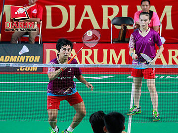 Ricky Alverino/Uswatun Khasanah (PB Djarum) mengembalikan kok ke arah pasangan Redi Perdana/Dini Fitri (SGS PLN).