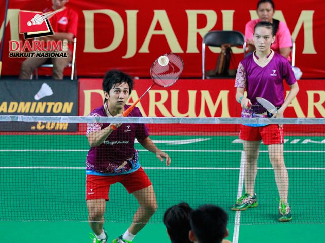 Rizko Asuro/Aneke Putri (Guna Dharma) menyambut serve dari Abu Bakar/Febriani Endar (PB Djarum).