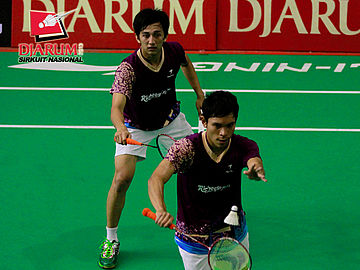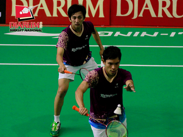 Abu Bakar / Tedi Supriadi (Djarum Kudus) mengembalikan smash lawan.