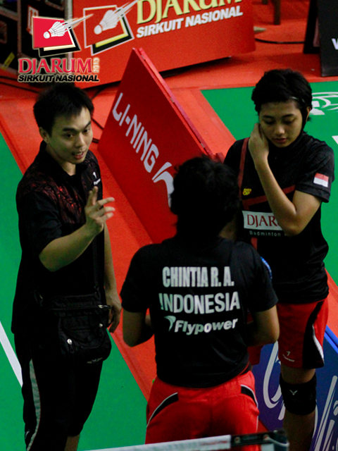 Chinthia Rhizta Andreti / Ravenska Cintya Adifta (Djarum Kudus) mendapatkan arahan dari pelatih.
