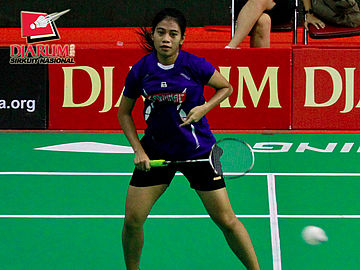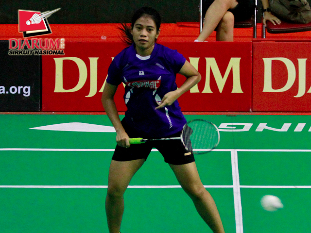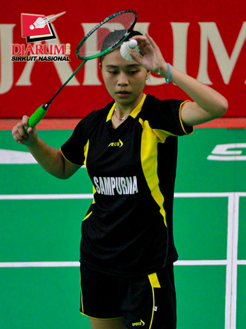 Febritia Adisthya Rato Putri (Mutiara Bandung) mengembalikan kok ke arah Marsa Indah Salsabila (Djarum Kudus).