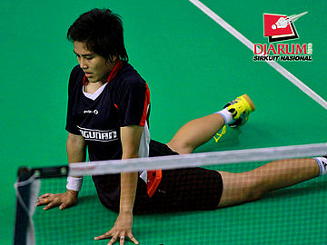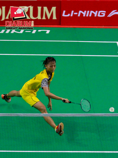 Intan Dwi Jayanti (Djarum Kudus) berusaha menggapai kok.