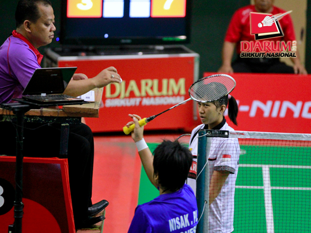 Nisak Puji Lestari meminta pergantian kok kepada wasit.