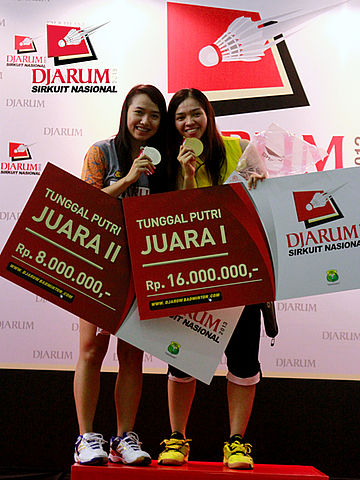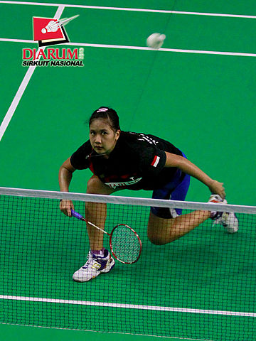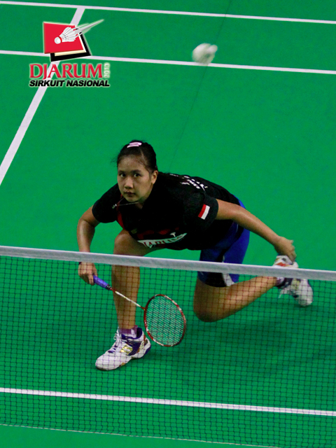 Rena Arsela (djarum Kudus) mengembalikan kok ke arah Fitriani (Exist Jakarta).