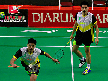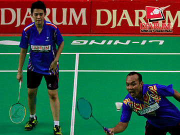 Trikusharjanto/ Vita Marisa (Pertamina Indonesia/Djarum Kudus) menyambar serve Marcus Fernaldi Gideon/Endang Nursugianti (Tangkas Specs).
