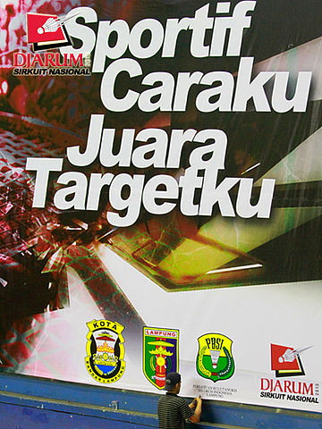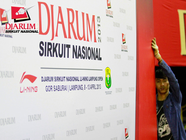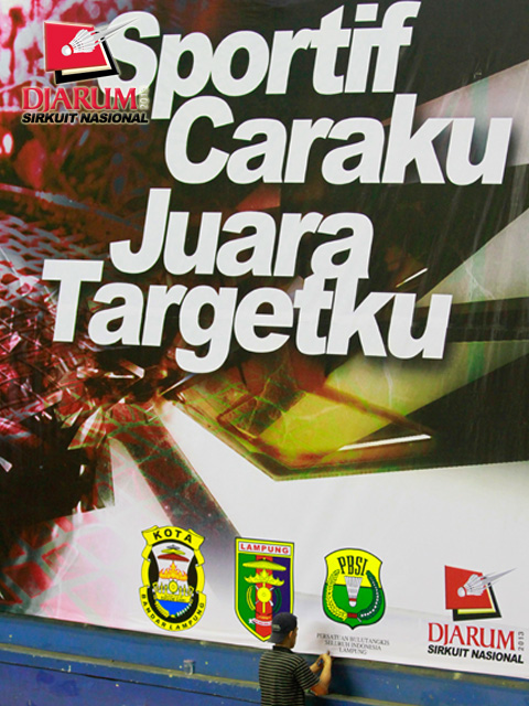 Seorang pekerja bersiap mengangkat backdrop Djarum Sirkuit Nasional Li-Ning Lampung Open 2013.