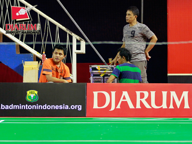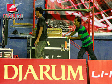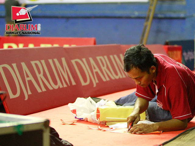 Dua pekerja sedang meletakkan peralatan perlengkapan Djarum Sirkuit Nasional Li-Ning Lampung Open 2013.
