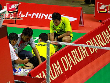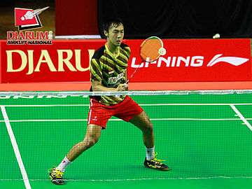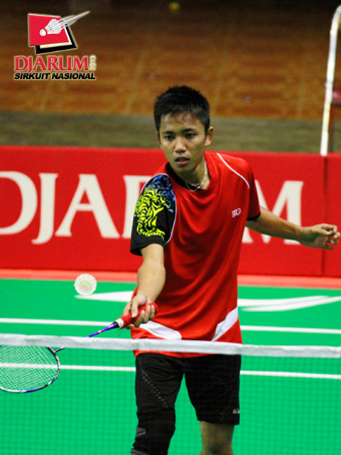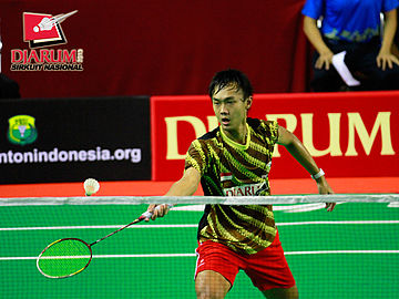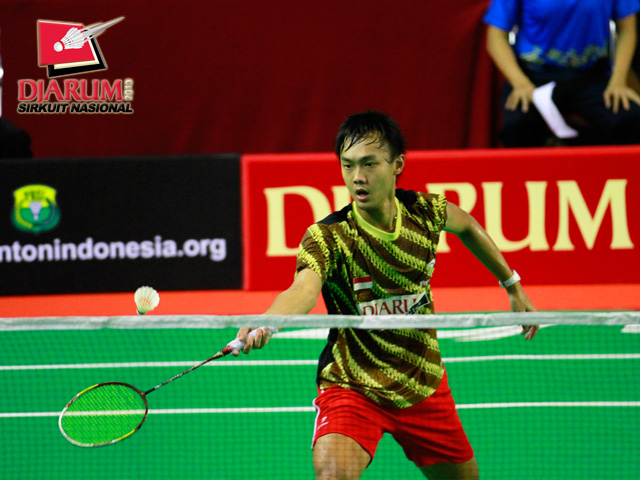 Febrian Irvanaldi (Hi Qua Wima) menyambut serve dari Denny (Srikandi).