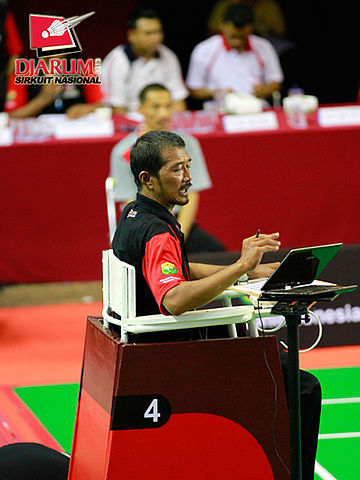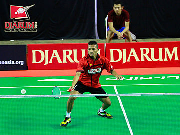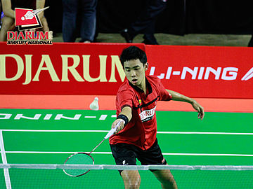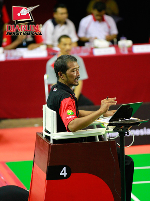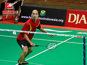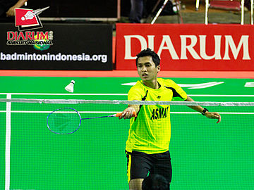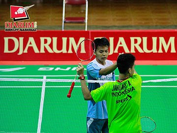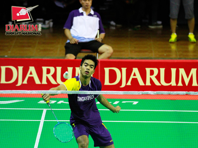 Kho Hendrikho (PB Djarum) mengembalikan kok ke arah Julkifli (Satria Diva).