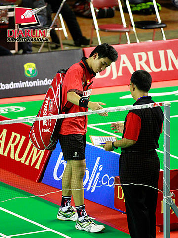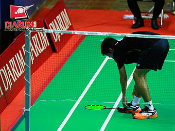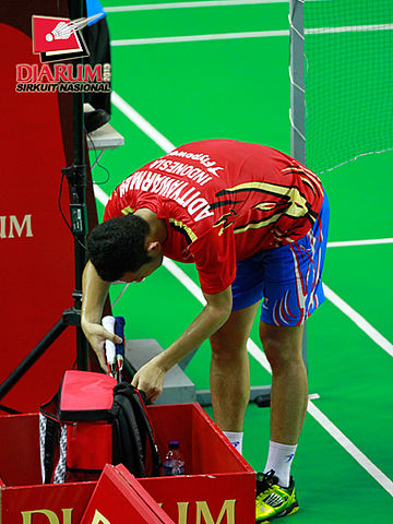 Andreas Adityawarman (Musica Champion) memilih raket yang akan digunakannya untuk bertanding.