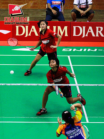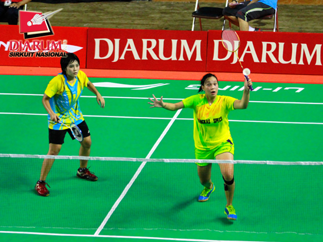 Jessica Shonan/Chintia Rhizta (PB Djarum) melepaskan serangan ke arah pasangan Clara Titi/Desaula Gendi (Pusdiklat Jaya Raya).