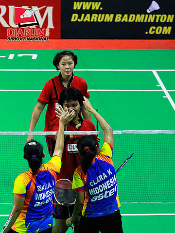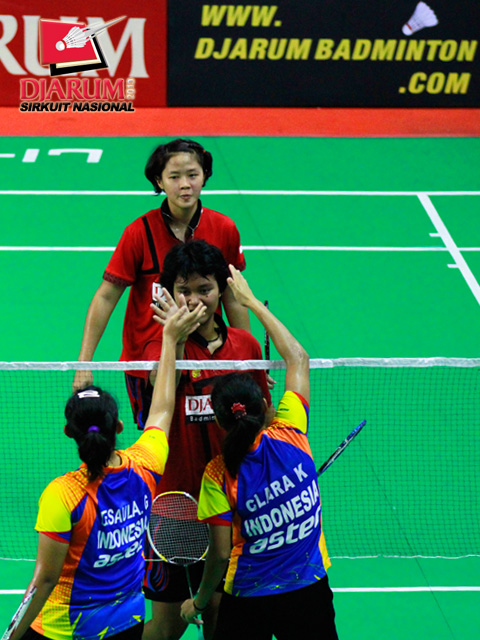 Jessica Shonan/Chintia Rhizta (PB Djarum) bersalaman dengan Clara Titi/Desaula Gendi (Pusdiklat Jaya Raya).