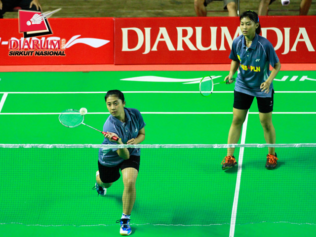 Dini Fitri/Inten Ratnasari (SGS PLN) menyambut serve dari Putri Sekartaji/Febrita Adisthya (Mutiara Bandung).