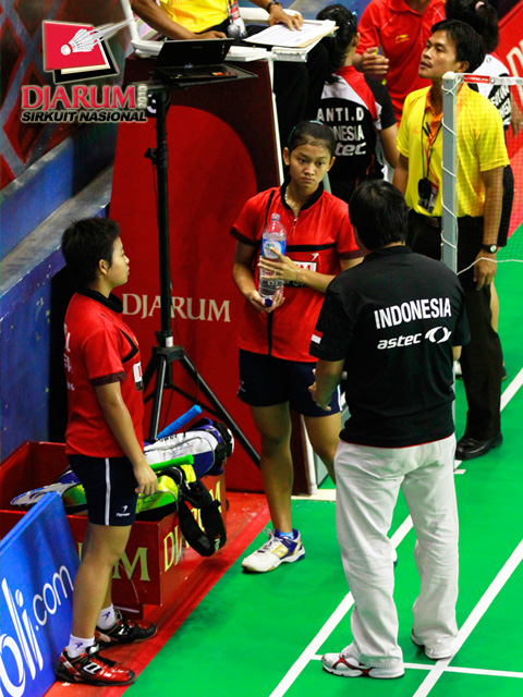 Pasangan ganda remaja putri PB Djarum, Chynthia Sara/Ramadhani Hastiyanti saat mendapatkan pengarahan dari pelatih.