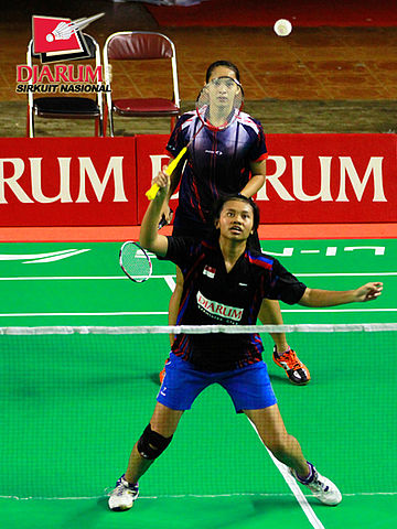 Pasangan ganda putri taruna, Masita Mahmudin/Uswatun Khasanah (Pusdiklat Jaya Raya/PB Djarum) bersiap menyambar bola tanggung dari Dina Khoirunisa/Liris (Pelatprov DKI Jakarta).