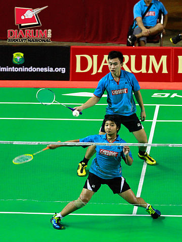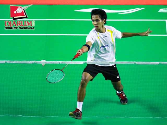 Garry Lam (Exist) menyambut serve dari Bandar Sigit (Sarwendah).