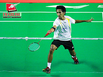 Bandar Sigit (Sarwendah) bersiap mengembalikan shuttlecock ke arah Garry Lam (Exist).