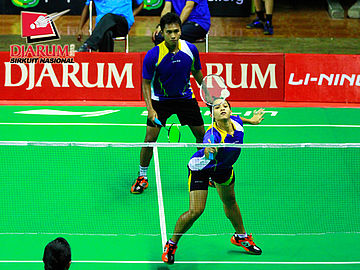 Trikus Haryanto/Nadya Melati (Pertamina) mengembalikan shuttlecock ke arah pasangan Dwi Setiawan/Lita Nurlita (Tsunami/SGS PLN).