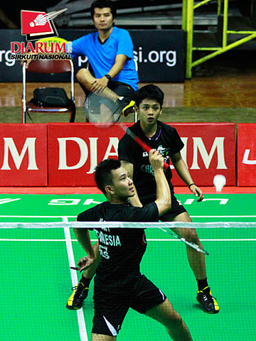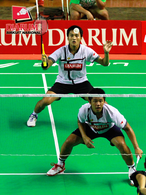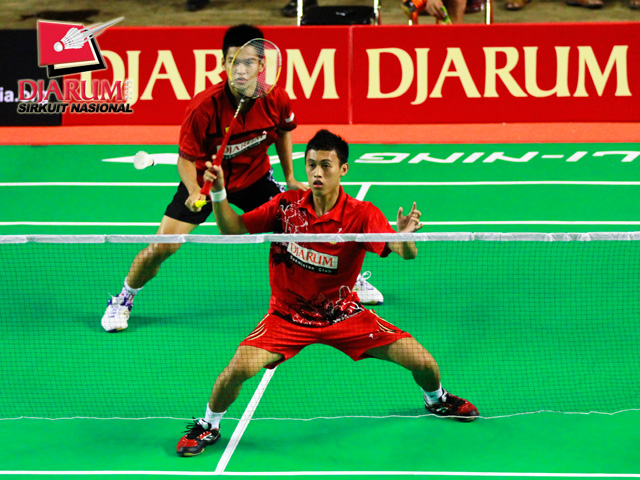 Abu Bakar/Tedi Supridi (PB Djarum) bersiap menghadang serangan yang dilancarkan Altof Baariq/Reinard (Mutiara Bandung).