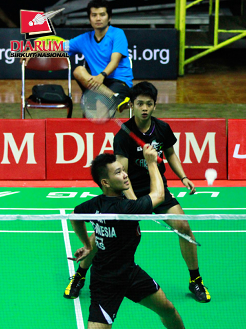 Arsya Isnanu/Yantoni Edy (PB Djarum) bersiap menghadang serangan yang dilepaskan pasangan budiman Faza/Fajar Alfian (Guna Dharma/SGS PLN).
