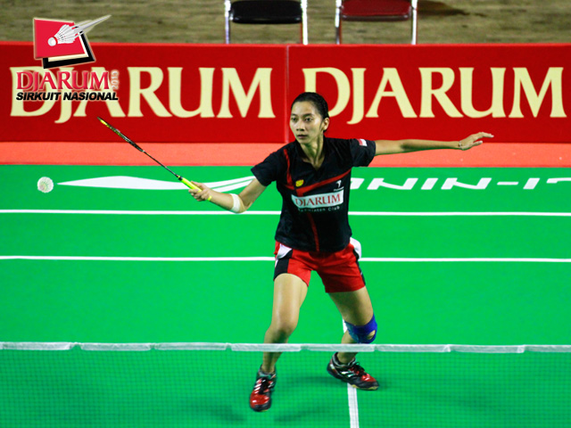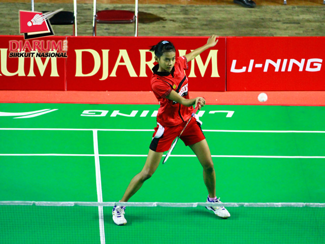 Ana Rovita (PB Djarum) mengembalikan shuttlecock ke arah Elysabeth Glorya (SGS PLN).