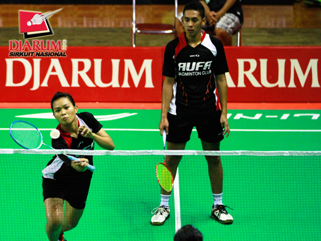M. Tegar/Zakia Ulfa (Aufa) menyambut serve dari pasangan Rian Swastedian/Masita Mahmudin (Pusdiklat Jaya Raya).