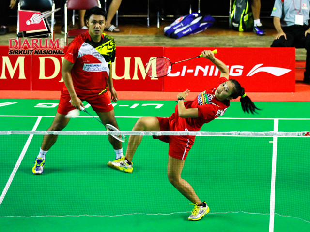 Ardiansyah Putra/Devi Tika Permatasari (Pertamina/SGS PLN) menyambar serve dari pasangan Ridho Akbar/Ery Octaviani (Halim/Pusdiklat Jaya Raya).