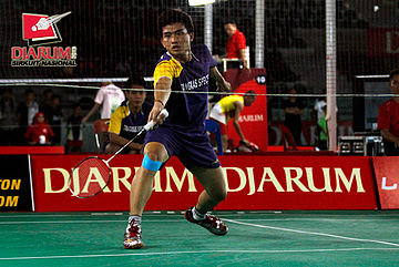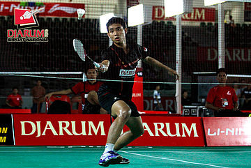 Taufik Hidayat (Indocafe Medan) berusaha mengembalikan shuttlecock ke arah Handoko (PB Alwaslyah).