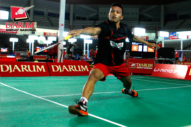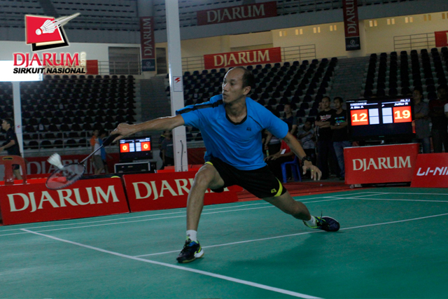 Reksy Aureza (PB Djarum) mengembalikan shuttlecock ke arah Bandar Sigit Pamungkas (Sarwendah).